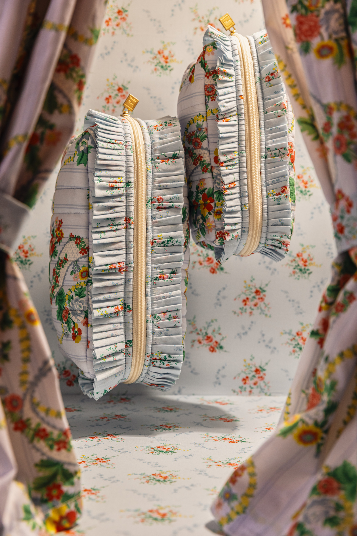 Inspired by a collection of 18th century hand-painted point papers from the Liberty archive, this design exudes poetic allure and graceful fluidity. Nostalgic rose, poppy, and daisy bouquets peek through finely embroidered ribbons and cascading floral chains, enhanced by a palette of soft pastel hues. The design takes on an eclectic twist with the addition of a fine background stripe, exuding a sense of whimsy and sophistication.